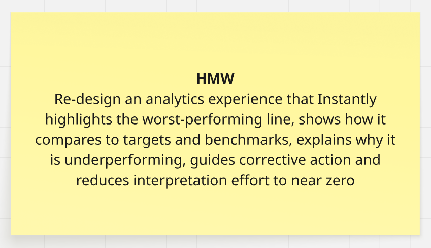 - Meaningless Visualizations, line charts dominated the interface, but users didn’t need trends — they needed prioritization. A line graph does not answer clearly which line is performing worst? How far is it from target? Is it underperforming compared to others?