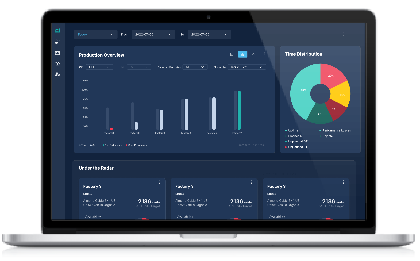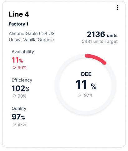 Instead of showing only aggregated OEE, users can now see at once, Availability, Performance and Quality. For each production line, alongside their respective targets. This allows them to immediately identify whether the issue is: Downtime (Availability), Speed (Performance) or Rejects (Quality). And whether each component is below benchmark.